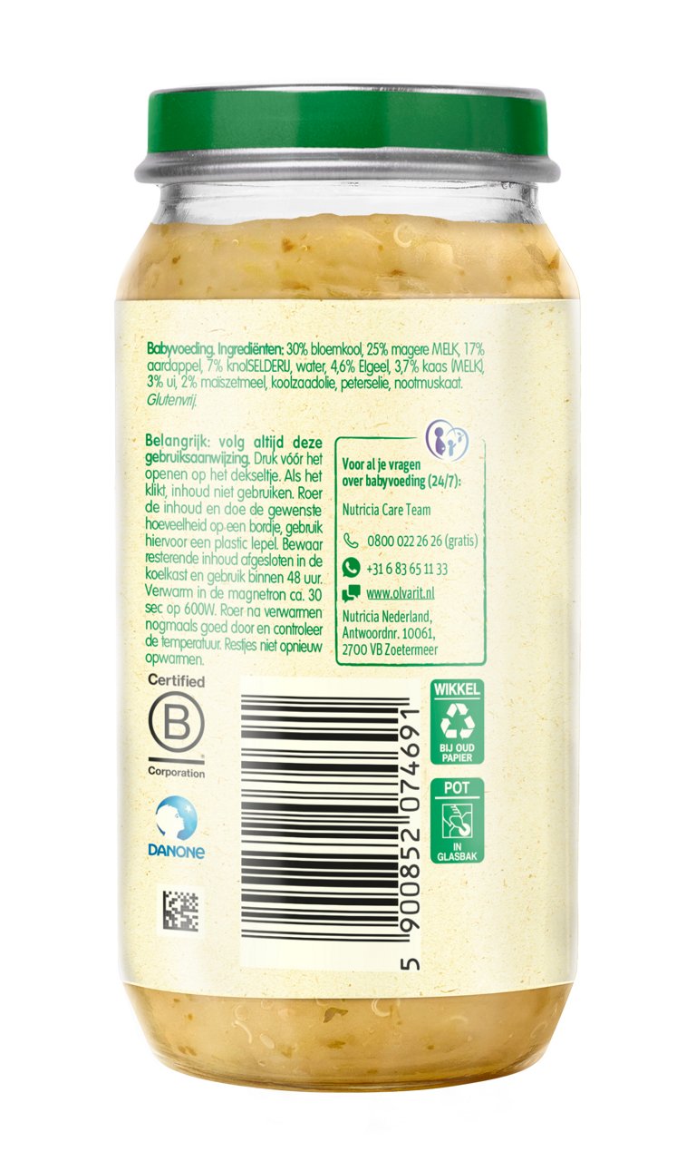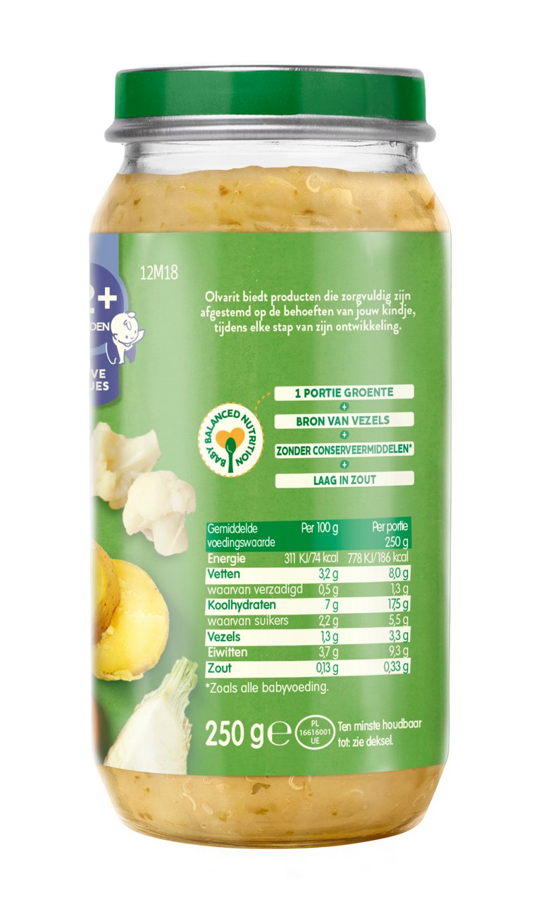 Olvarit Bloemkoolschotel met Knolselderij en Ei is een babyhapje met pure & natuurlijke ingrediënten voor baby's van 12+ maanden. De babyvoeding heeft een herkenbare smaak en textuur dat bijdraagt aan de smaakontwikkeling.