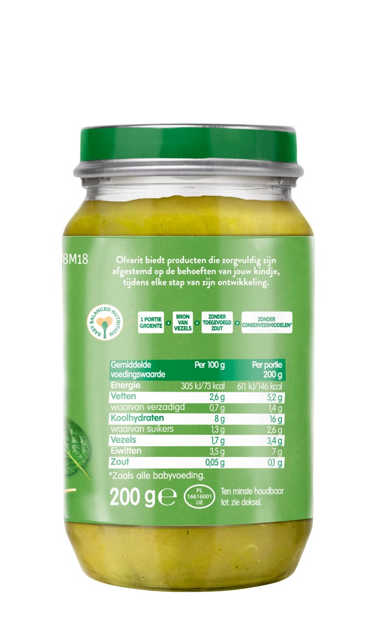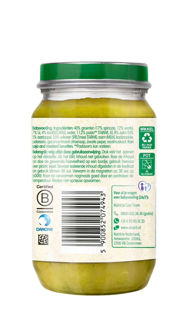 Olvarit Pasta Spinazie Zalm is een babyhapje met pure & natuurlijke ingrediënten voor baby’s van 8+ maanden. De babyvoeding heeft een herkenbare smaak en textuur dat bijdraagt aan de smaakontwikkeling.