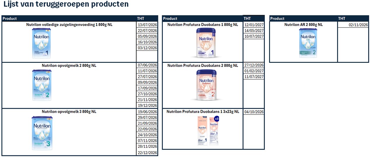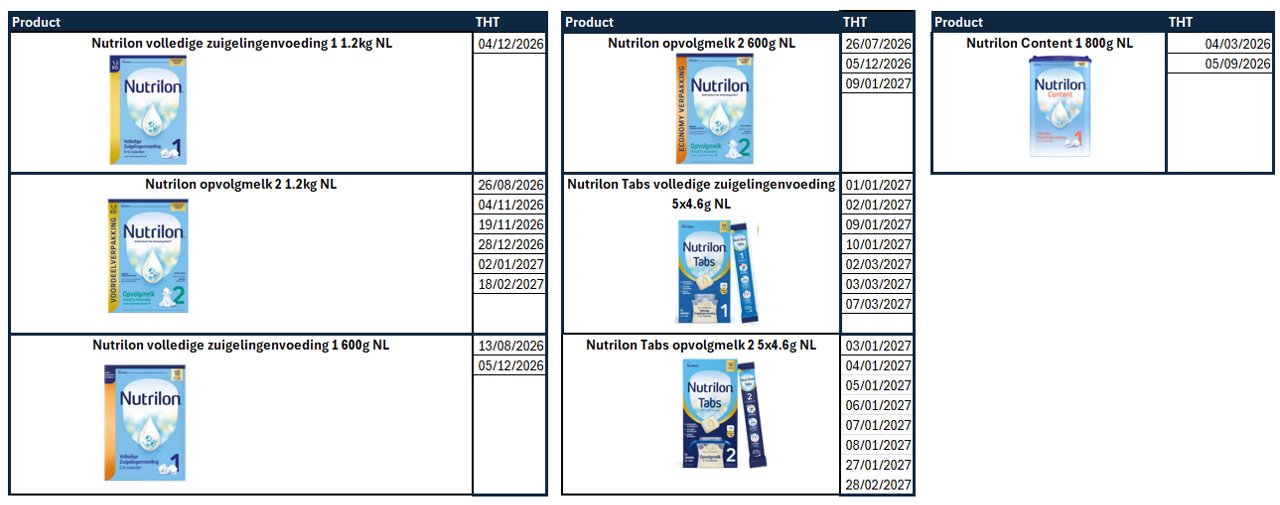Danone heeft, in het licht van de evoluerende richtlijnen van de EU-autoriteiten, waaronder het nieuwe advies van EFSA, in overleg met het NVWA besloten om onderstaande batches terug te roepen.